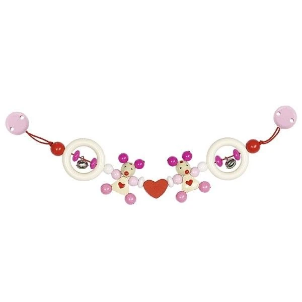 Pour les touts petits voyageurs, cette magnifique Chaîne de Poussette à clipper en bois Heimess ‘Chaîne Poussette avec clips Mes Souris Roses Heimess’ de la série Souris Roses, est magnifiquement décorée. 2 petites copines en bois de hêtre aux couleurs de bonbon, toutes brillantes et amusantes. La chaîne de poussette se compose de 2 hochets anneaux de grelots, 2 souris roses et une perle pendentif cœur… Une belle harmonie dans les tons de roses, blanc et rouge, pour accompagner et distraire bébé en poussette et sur se chaise. . Et bien sur les clips magiques, permettent de l’accrocher au berceau ou à la poussette..