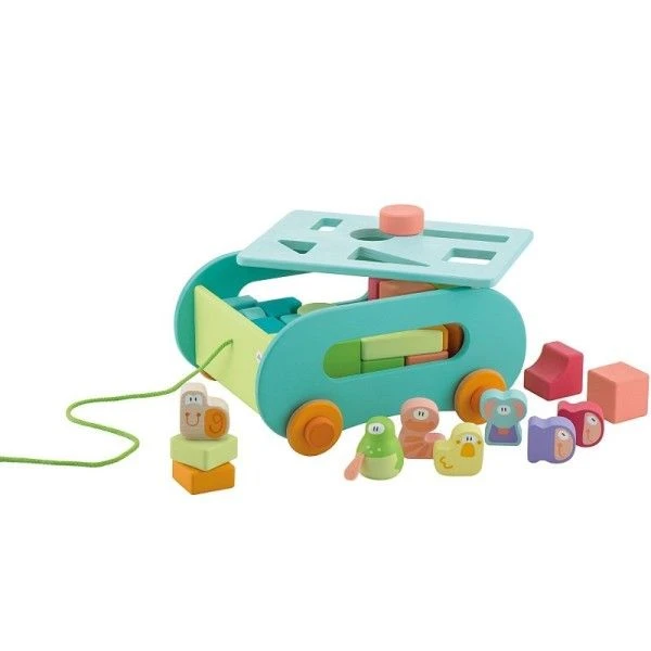 Pour les petits aventuriers dés 12 mois, éveil physique et émotions avec ce joli jouet en bois multi-activité Chariot de Cubes Boite à Forme Sevi 1831 ‘Mon étang’. Un joli jouet coloré multi activités amusant sur le thème de l’apprentissage de la marche au milieu de l’étang…. La Boite à forme est un petit chariot à traîner permettant de favoriser l’apprentissage de la marche et les équilibres… le chariot de marche contient une trentaine de cubes et formes sur le thème de l’étang. De la grenouille à l’escargot en passant par les petits poissons, bébé fera de belle découvertes et de beaux édifices avant de tout ranger et de repartir se promener. Le dessus du chariot fait office de boite à formes en reprenant les différentes géométries de chaque cubes…chrono en main combien de temps pour 30 cubes!!! Un jouet idéal contient pour développer l’imagination tout en combinant: