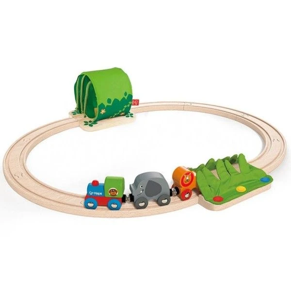 Pour les amoureux de petits trains et de nature dès 18 mois, éveil physique & émotionnel avec ce coffret de petit train en bois Hape ‘Circuit Train en Bois ‘Dans la Jungle’ Hape’. Pour se dégourdir les doigts, les yeux s’amuser à promener ses amis singe, Lion et éléphant au coeur de la jungle, sous la canopé et ressentir les caresses des branches et des feuilles bruissonnantes sur sa peau… Que de sensations et de découvertes avec ce circuit train merveilleux, dont la locomotive pilotée par le singe traîne un bel éléphant et un lion bien coloré … les petits explorateurs seront au paradis.