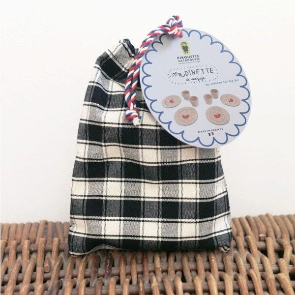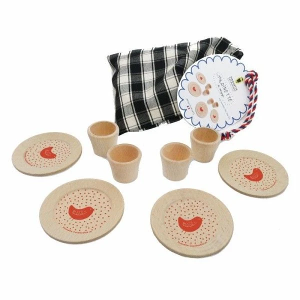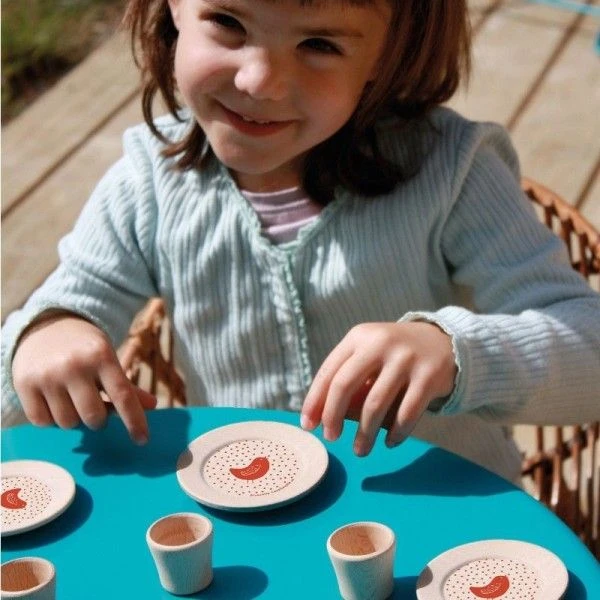 Trop jolie, trop mignonne !! Cette dînette est composée de 4 assiettes et 4 verres en bois de hêtre issus de forêts françaises durablement gérées. Chaque pièce est tournée et imprimée de façon artisanale en France. Son sac en coton est également entièrement fabriqué en France, du tissage à la confection ! Le jeu de dînette est un jeu d’imitation qui permet à l’enfant d’occuper un instant la place de l’adulte. Entouré de copains, de copines, de peluches ou de poupées, c’est tout un imaginaire qui se développe et à travers lequel l’enfant apprend à partager.