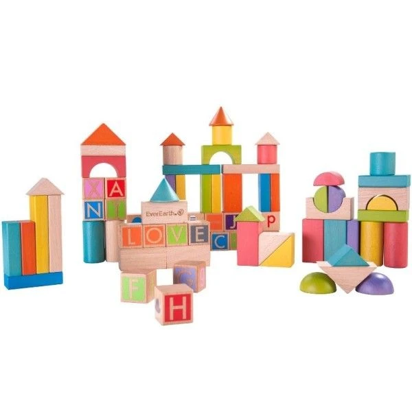 Pour les petits bâtisseurs, architectes et pour apprendre leur alphabet dés 18 mois,… découvertes physiques et émotionnelles, en douceur et en couleurs avec ce superbe ensemble de blocs et cubes colorés EverEarth® Cubes & Blocs de construction Abécédaire (EN) 80 pièces dont les cubes sont un abécédaires en anglais…, Trier, édifier, identifier, reconnaître couleurs et lettres, associer les lettres aux dessins et aux mots, … rien de tel pour se dégourdir les méninges et les petits doigts. Après avoir empiler les cubes, former des mots, repenser le Colisée, … nos petits héros pourrons ranger chaque blocs dans le sac en coton. Les ensembles de cubes permettent de développer la mobilité fine, la perception des formes, des couleurs et des équilibres. Les cubes et formes à empiler EverEarth® sont en bois de hêtre massif naturel et colorés à partir de teintes naturelles sur base aqueuse (a l’eau).