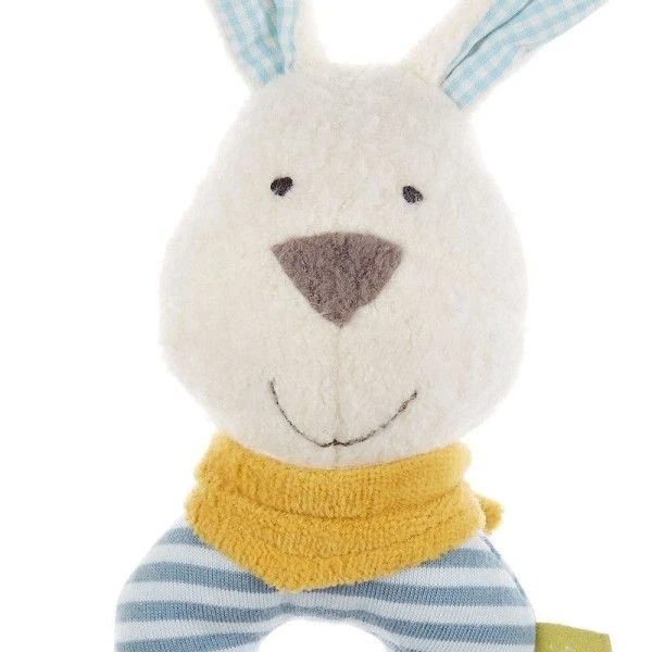 Pour les bébés bio & écolo, et dès la naissance, Eveil, confort & réconfort en compagnie de ce joli Hochet Anneau de dentition Bio Sigikid® Lapin Bleu Green 14 cm. Un joli hochet de tissu en forme de lapin sympathique pour tenir compagnie à bébé. Combinant hochet tintinnabulant et anneau de dentition en bois de hêtre, ce petit hochet lapin avec ses petits yeux curieux, ses grandes oreilles et son corps en forme d’anneau… ses oreilles pour mieux le tenir et le mâchouiller tendrement, ne quittera plus bébé. Protecteur de la nature et défenseur du développement durable, bébé le revendique avec ce joli doudou lapin, amusant, protecteur, Chic & écolo. Les boucles de velours de coton bio à la texture douce de notre doudou offrent des sensations tactiles et visuelles inoubliables. En compagnie de ce doudou bio en coton, rempli de Laine naturelle et de coton, bébé est prêt à affronter le monde, en douceur, en couleur et en sécurité: Le doudou est en coton, un Coton Bio issu de l’agriculture Biologique (Kba : Agriculture Biologique Contrôlée)et rembourré en laine.