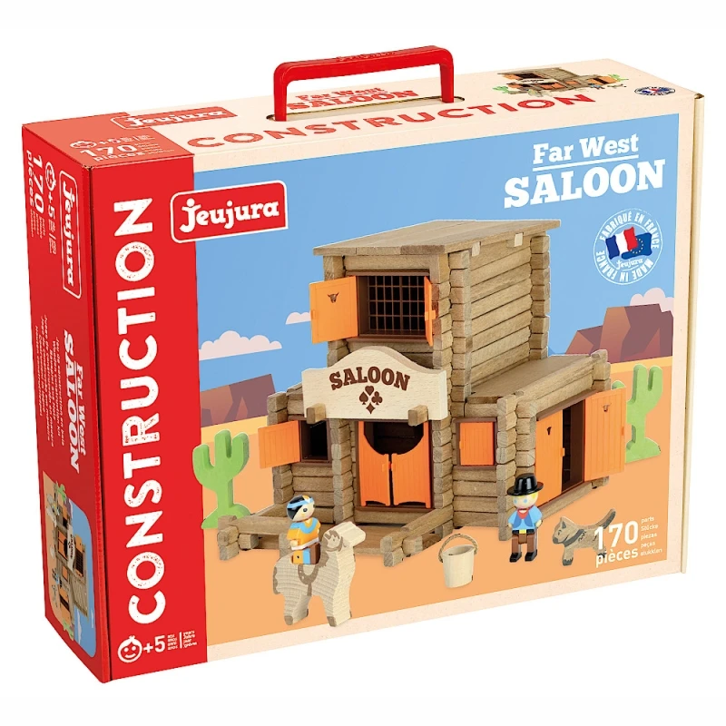 Pour les petits bâtisseurs amoureux de cow boys et de far west dés 5 ans, imagination, éveil et construction avec cet ensemble de 170 pièces, lieu mythique et incontournable des aventures de Far West, le Saloon ‘Jeu de Construction en bois Far West Le Saloon 170 pièces Jeujura®’. Un jouet de construction en bois, ludique et amusant pour se plonger au coeur de l’aventure des pionniers américains, les fermiers du Grand Ouest, ces cow boys et bien sûr lien social mythique et incontournable, où l’on retrouve les Vedettes de la gâchette, …le fameux Saloon. 170 pièces en bois naturel teinté, les petits madriers originaux de chez Jeujura® qui éveillent les sens et l’imaginaire des petits depuis 100 ans.