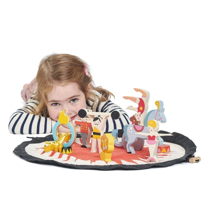 Pour les fans de cirque dés 36 mois éveil émotionnel et, physique avec ce tendre et amusant Jeu en bois d’équilibres Figurines du Cirque Tender Leaf Toys®. S’inventer un spectacle de cirque en créant les équilibres les plus fous avec les acrobates, dompter les lions et les tigres, faire dresser les éléphants … Un jouet en bois qui permet d’affiner la motricité fine des petits et de jouer avec leur imagination… Le sac de rangement se déplie pour se transformer en piste de cirque. un jeu créatif qui plaira aux petits acrobates en herbe.