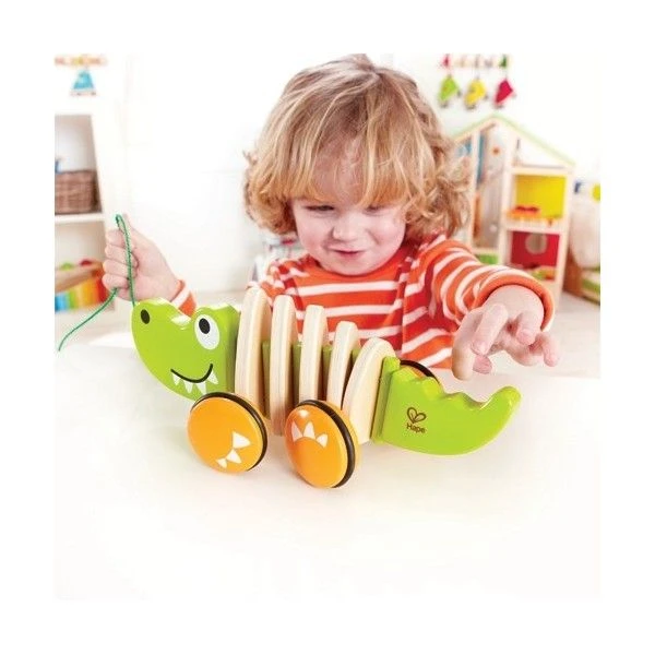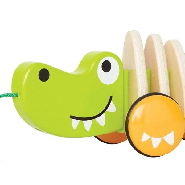 Pour les petits promeneurs à partir de 12 mois, éveil physique et émotionnel avec cet amusant Crocodile à traîner en Bois Naturel, d’un joli vert et doté d’un gentils sourire. Un Crocodile en bois qui se dandine, ondule et remue la queue en se promenant, tout en affichant un large sourire, content de suivre son acolyte…pour lui croquer le derrière!!