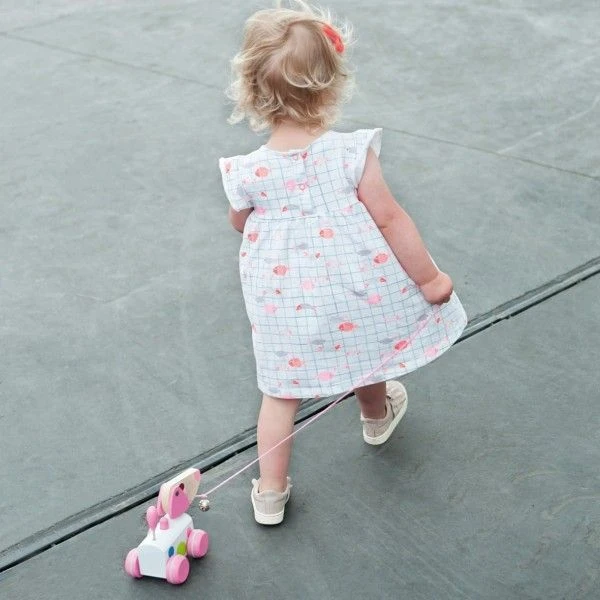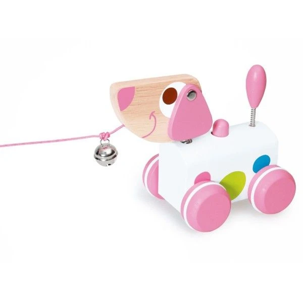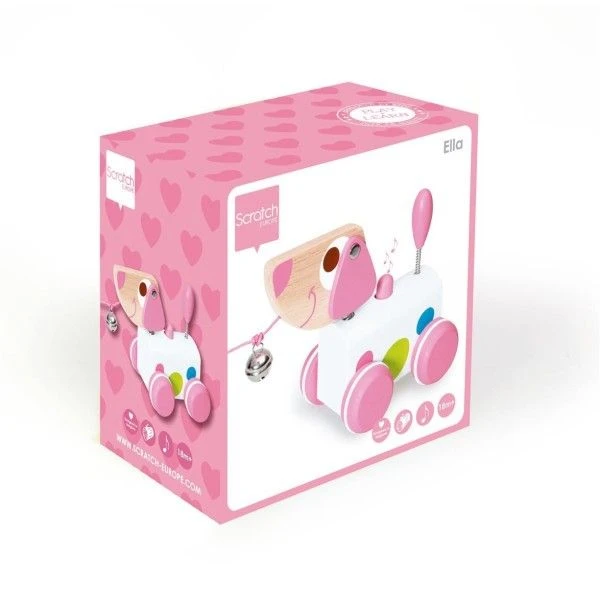 Pour les petits promeneurs amoureux des chiens dés 12 mois, éveil physique et émotionnel avec ce joli jouet en bois à trainer pour éveiller la marche, l’équilibre de bébé!! … Jouet en bois à trainer 4 Roues Chien Ella Rose & Blanche Scratch®. Un petit chien Blanc et Rose avec de belles oreilles pendants, une queue bien droite et des pois de couleurs sur les flancs. Lorsque bébé la promène, le grelot s’agite et tintinnabule pour motiver bébé à poursuivre ses exercices… Un beau jouet en bois à trainer, magnifiquement réalisé en bois de hêtre. Un jouet en bois aux formes arrondies, pour apprendre à marcher et à se déplacer en couleur et en compagnie de son sympathique petit Chien Ella.