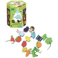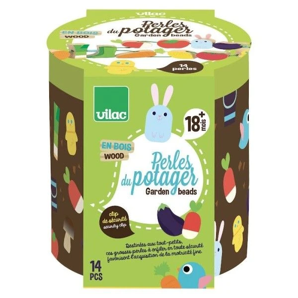 Pour les petits amoureux du jardin dés 18 mois, éveil physique et émotionnel avec ce Jouet en Bois Perle du potager Jour de récolte Vilac®. Un jeu de perles de bois joliment illustrées sur le thème du potager… Autant de radis, carottes, poireaux et autres petits animaux du jardin à enfiler sur un lacet et développer sa motricité fine tout en s’amusant…Le jour de récolte des légumes du jardin quel grand moment!