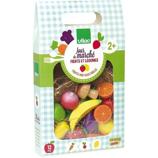 Jouet en bois Set de Fruits & Légumes ‘Jour de Marché’ Marchand(e) Vilac® – Pour les petits marchands ou les cuisiniers en herbe, et par amour des bons produits bio, dés 36 mois, imagination et émotion avec ces accessoires  pour dînette ou jouet de marchan(e) Vilac®…