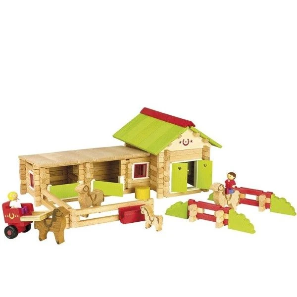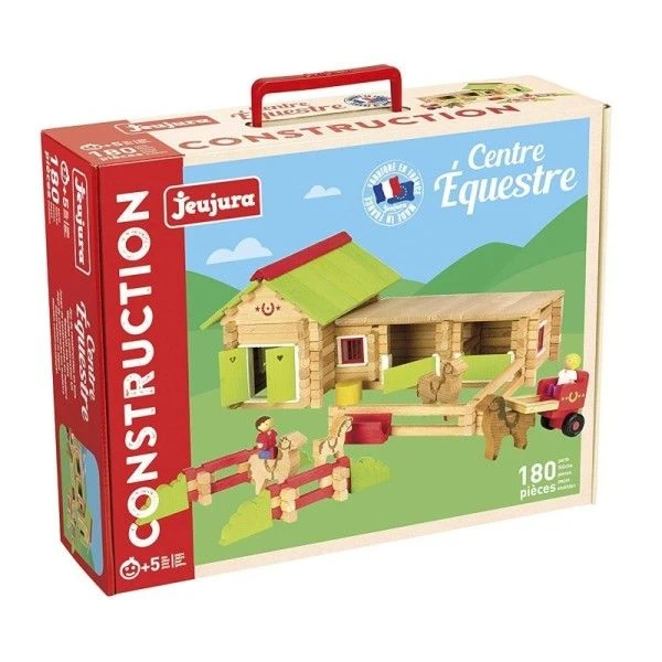 Dès 5 ans, pour les petites passionnées d’équitations, du monde équestre et de la construction; éveil émotionnel et imagination avec ce magnifique Centre équestre en Rondins à construire Jouet en bois Jeujura® Centre Équestre 180 pièces …Ce magnifique Jeu de construction de 180 pièces, ‘nouveauté’ de la mythique gamme de jouet de construction Jeujura®, émerveillera autant les petites cavalières, que leurs parents. Les 180 pièces permettent de créer un bel ensemble pour s’amuser et imaginer des aventures à cheval… Comme les autres jouets Jeujura®, la construction est en madriers traditionnels, en bois couleur Naturel, Rose et vert. Le centre se compose d’écuries (2 boxes), d’une grange, d’une palissade, d’une calèche, de deux obstacles arborés, de deux bottes de pailles, et d’un abreuvoir. Trois chevaux, un chien et deux personnages (1 moniteur de centre et 1 cavalière) permettent d’imaginer la vie du centre. Un jouet intemporel fabriqué pour durer, qui rappellera certainement quelques souvenirs aux parents qui ont eu la chance de jouer avec ces jouets de construction en bois.