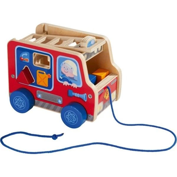 Pin-pon, pin-pon, les pompiers sont là ! Tirer le joli camion de pompier encourage les enfants à marcher à quatre pattes puis debout. Les petits peuvent développer leur motricité fine en classant les briques en bois multicolores assorties.