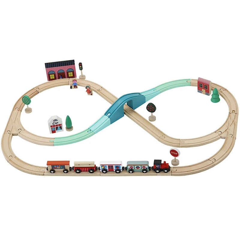 En voiture voyageurs, montez à bord du train Grand Express d’Ingela P.Arrhenius. Un joli circuit de train de 40 pièces en bois composé de : 1 locomotive, 4 wagons, circuit 24 pièces, 1 gare, 2 maisons, 2 personnages, 4 arbres et 2 panneaux de signalisation.