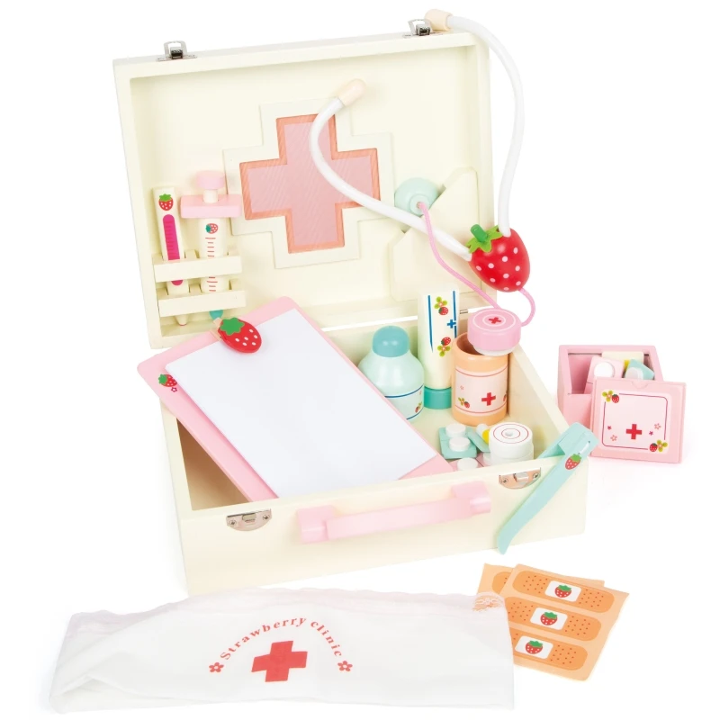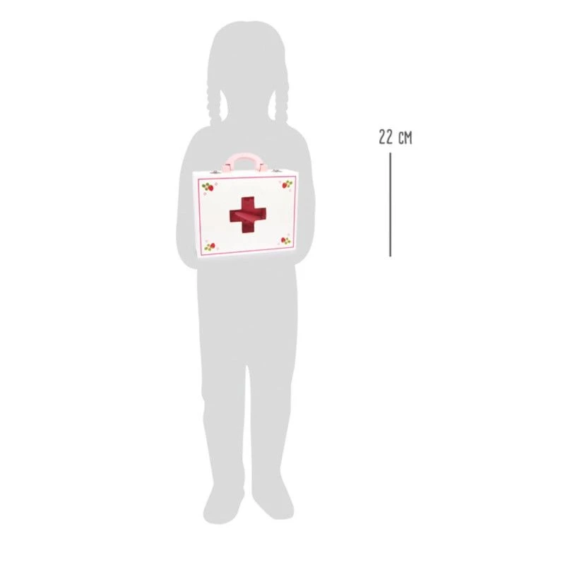 Équipée d‘un thermomètre, stéthoscope et coiffe, chaque petite infirmière peut faire sa visite dans la clinique de poupée! Avec de nombreux accessoires en bois laqué: stéthoscope, thermomètre, seringue, pince, charlotte porte-bloc avec feuilles, boîte à pilules avec 6 « plaquettes cachet », tube à crème, flacon à teinture et 6 bandes de sparadrap.