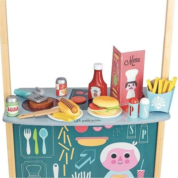 Inspiré des food trucks, ce petit resto avec hamburgers, frites, sodas et de nombreux autres accessoires sera parfait pour jouer les petits cuisiniers !