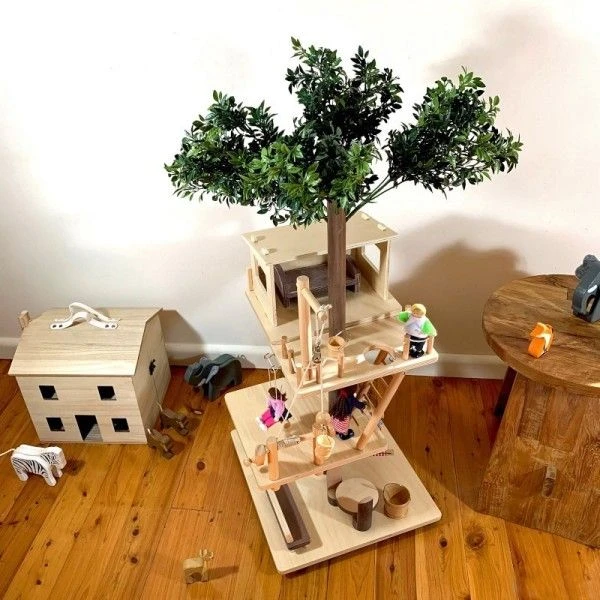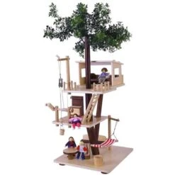 Les jouets d’imitation comme cette cabane dans les arbres, sont recommandés pour le développement de l’enfant et favorisent les jeux de rôles, la construction de soi et la compréhension de l’environnement social. En imitant, l’enfant interagit avec son environnement, il construit ainsi ses structures cognitives. En manipulant de nombreux petits objets, comme les petits accessoires des maisons de poupées, il développe sa motricité fine. Lorsque l’enfant met en scène les personnages, les accessoires de sa maison de poupée, il ajuste ses gestes pour parvenir à son but. Enfin, l’imitation joue un rôle majeur dans la socialisation. Le fait de jouer d’autres rôles permet de prendre conscience de l’existence de l’autre mais aussi de soi-même et de jouer en interaction.