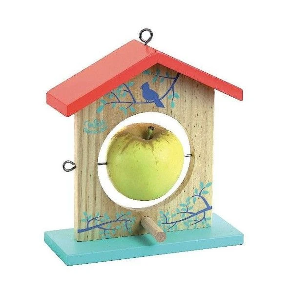 Une maisonnette à oiseaux en bois sur laquelle on peut accrocher une pomme, du maïs, un bout de pain etc… Chut, il ne faut pas faire de bruit pour observer les oiseaux manger !