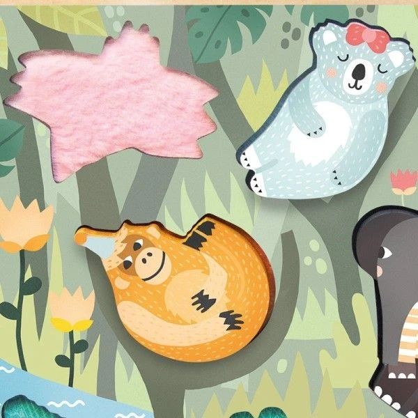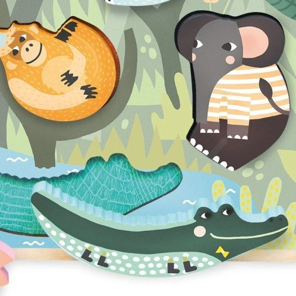 Un encastrement poétique sur le thème de la jungle dessiné par Michelle Carlslund. Les textures animalières sont à découvrir quand on soulève les pièces. Les animaux feront également de très bons compagnons de jeux..