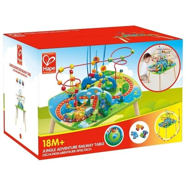 Pour les petits explorateurs écolos dès 18 mois, éveil physique & émotionnel avec cette magnifique table d’activités Table d’activités Circuit Train Jungle Hape. Une magnifique table multi-activités pour se plonger au cœur de la Jungle, découvrir les animaux et les fleurs de la canopée grâce au Looping ‘magic Jungle’ … rencontrer les grands animaux confortablement installé dans le train ‘Trans’Jungle’… le tout en développant ses capacités d’explorateur!! Les couleurs, les formes, les animaux sauvages n’auront plus de secret pour nos petits experts de la jungle. Que d’aventures pour se dégourdir les doigts. Chaque atelier permet de solliciter la réflexion, l’imagination, les causes à effets, ou la logique. Pour développer la dextérité, la coordination œil-main, l’apprentissage des couleurs, …